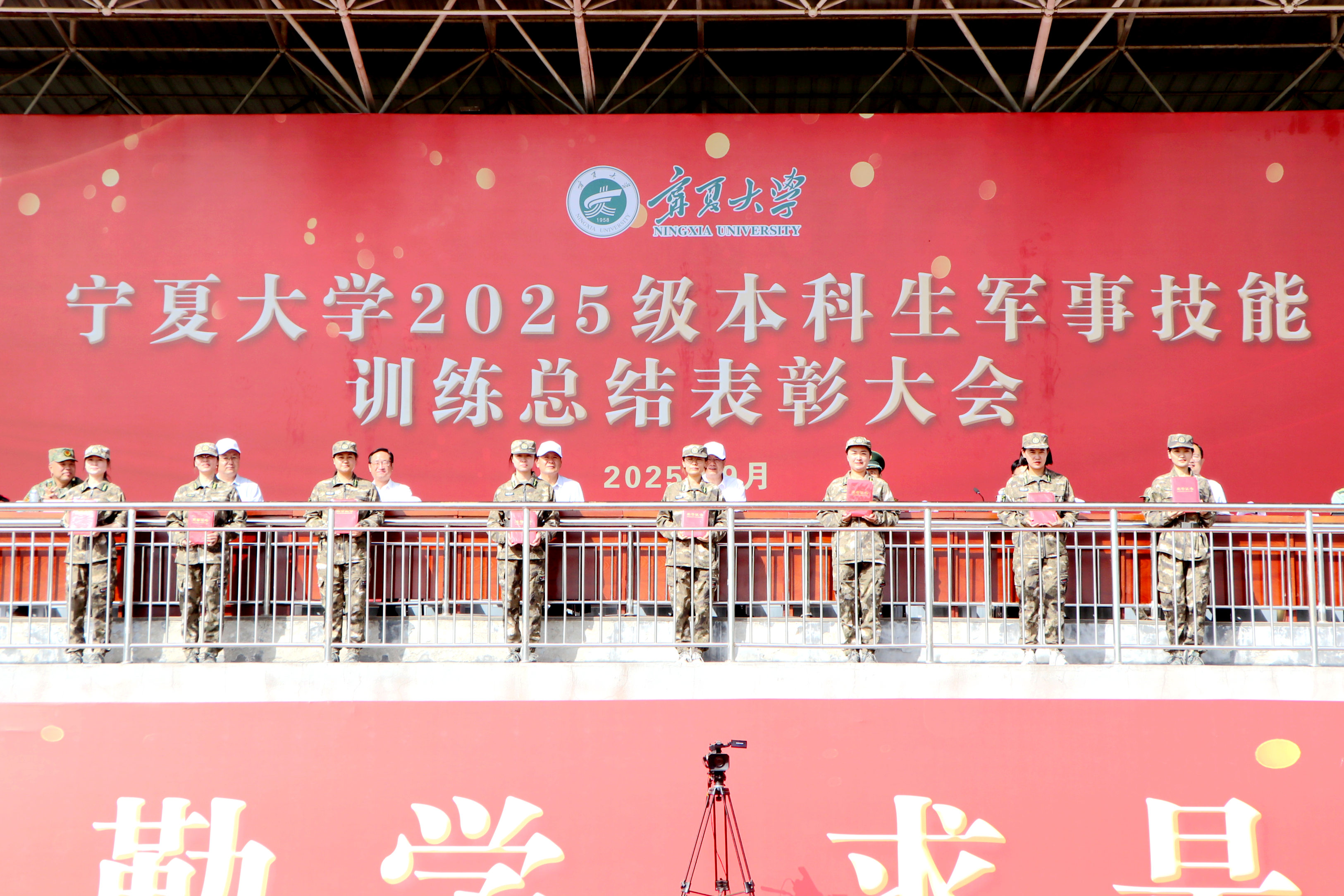 【宁夏大学新闻中心讯 李瑾/文 张景/图】9月14日,在宁夏大学建校67周年生日前夕,学校在怀远校区田径场隆重举行2025级本科生军事技能训练总结表彰大会。校领导王宏伟、黄河、马元、杨文法,武警银川某部相关领导,自治区教育厅体卫艺处二级调研员马希林,宁夏大学办公室主任冯学文出席大会。校党委学生工作部(学生处)部(处)长、军训团政委马正亮主持大会。