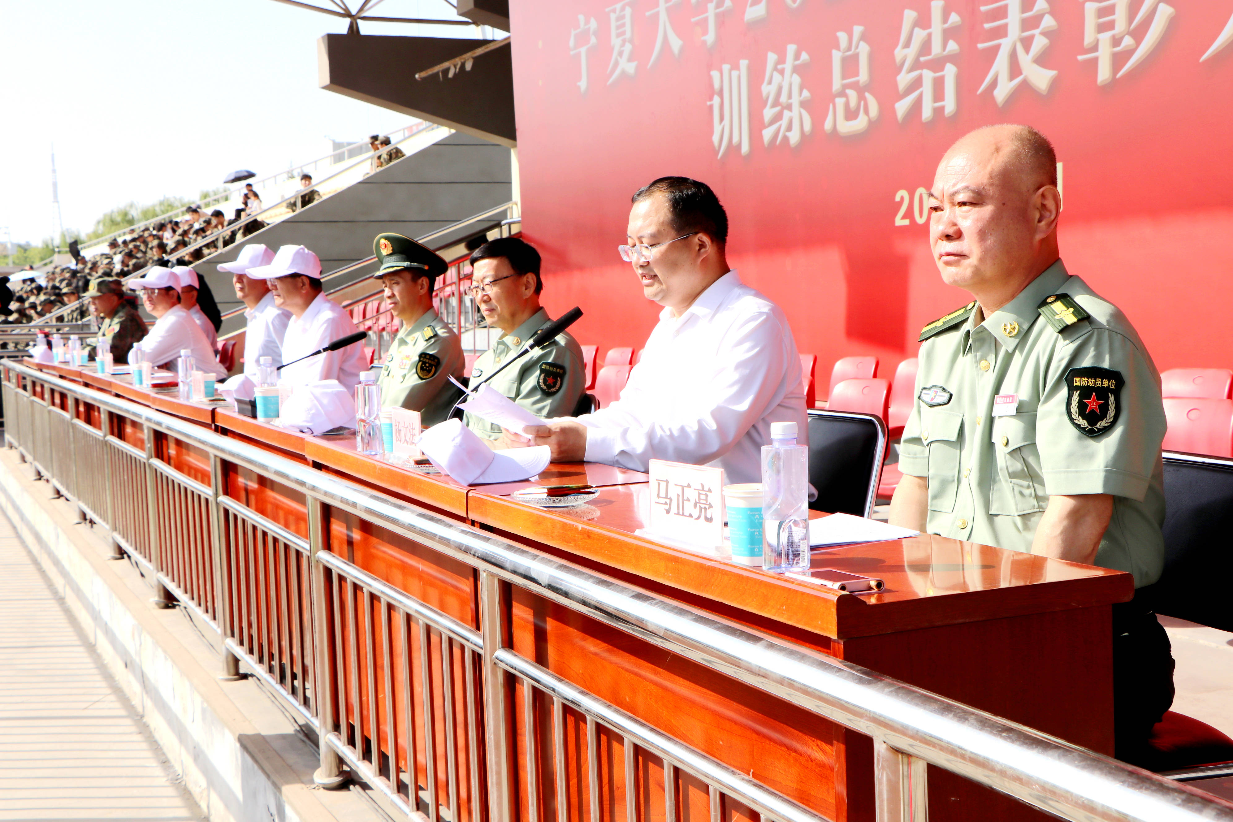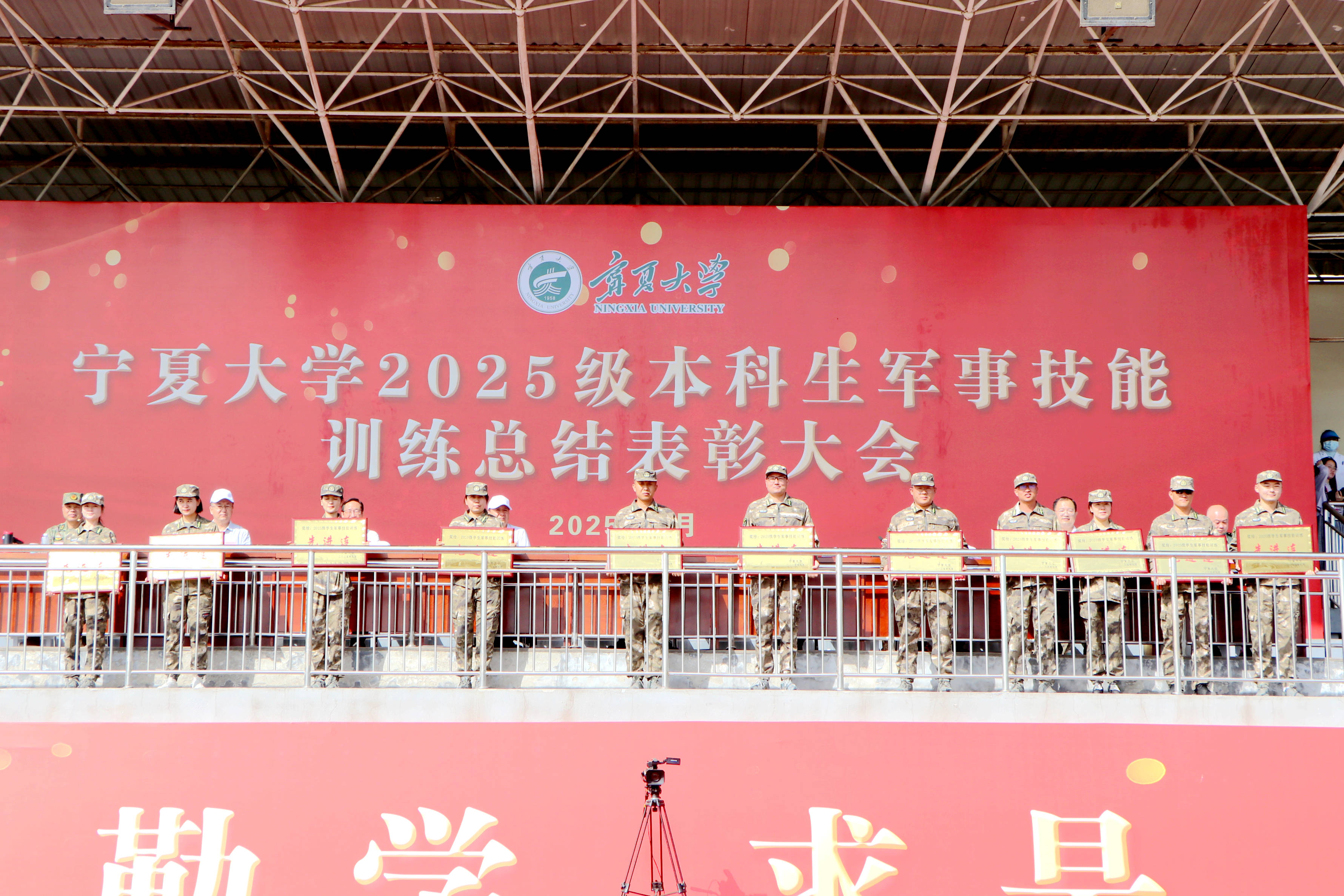总结表彰大会在全体师生官兵齐唱中华人民共和国国歌中开始。校党委常委、副校长杨文法宣读《宁夏大学2025级本科生军训工作先进单位及先进个人表彰决定》。主席台领导先后为获得军训先进营、单项奖、优秀组织奖、精神文明奖和先进连的单位,获得“军训优秀教师”“军训优秀学生”和“军训优秀教官”的个人代表颁奖。