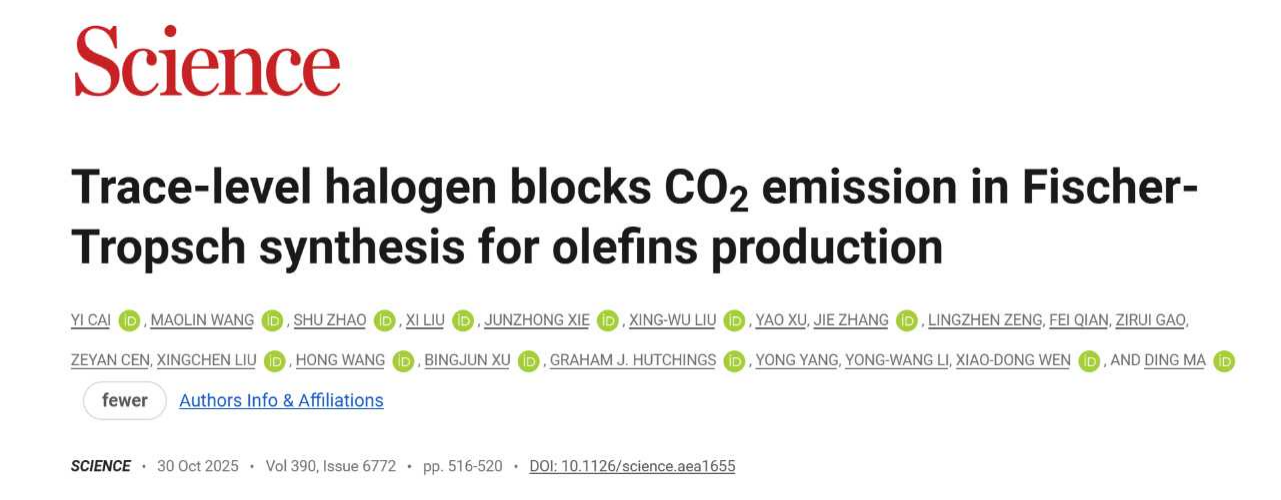 【宁夏大学新闻中心讯 化学化工学院】近日,中国科学院山西煤炭化学研究所与北京大学、宁夏大学等单位联合主导的科研团队以"Trace-level halogen blocks CO2emission in Fischer-Tropsch synthesis for olefins production"为题发表在《Science》期刊上,我校刘晰教授为本文共同第一作者,宁夏大学为共同第一单位。