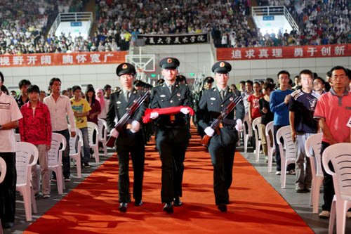 【宁夏大学新闻中心讯 黄二宁/图 翟 伟/文】9月15日下午,我校2010级新生开学典礼在大学生活动中心隆重举行。学校党政领导齐岳、何建国、赵利宁、李伟、王燕昌、李星、谢应忠出席典礼。