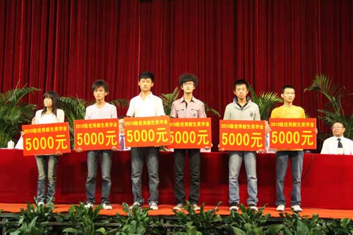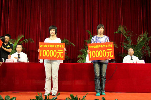 王燕昌副校长宣读了《宁夏大学关于颁发2010年优秀新生奖学金的决定》,张姝等2人、刘建等6人分获宁夏大学2010年优秀新生一、二等奖学金。与会领导为获奖新生颁奖。