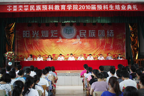 【宁夏大学新闻中心讯 马占俊】6月24日上午,民族预科教育学院2010届预科生结业典礼在南校区大学生活动中心隆重举行。校党委副书记赵利宁、副校长李伟,自治区民族事务委员会文化教育处处长周国海,校学生处处长王宏伟,民族预科教育学院党政领导郝育兰、王俊、田富军、石慧刚、马玉玲、马军、尹军利出席了典礼。典礼由民族预科教育学院直属党支部书记郝育兰主持。