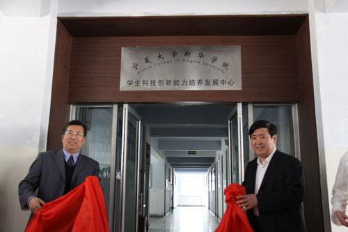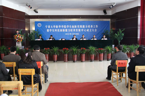 【宁夏大学新闻中心讯 曾华/图 翟伟 黄颖轩/文】3月30日下午,新华学院学生创新实践能力培养工作暨学生科技创新能力培养发展中心成立大会在新华学院大学生活动中心隆重举行。何建国校长出席会议并为中心揭牌。新华学院党政领导刘炜、张桓、雍少华、党小龙、周波、黄占银与学院各部门负责人、教师代表、学生代表参加会议。会议由学院副院长党小龙主持。