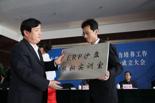 会议结束后,何建国校长在新华学院领导的陪同下观摩指导了学生ERP模拟沙盘比赛,并为学生科技创新能力培养发展中心揭牌。
