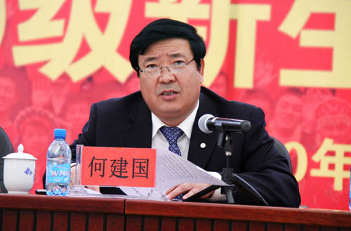 在雄壮的国歌声中,典礼正式开始。何建国校长在典礼上作重要讲话。他代表学校对新同学的到来表示热烈欢迎,并对新同学们成为宁夏大学的光荣一员表示衷心的祝贺。何建国校长希望新同学们能够树立高度的社会责任感,清醒地认识自己所肩负的历史使命,奋发成才,不辜负党和国家、社会、学校、家庭给予的殷切期望;要刻苦学习,努力掌握大学的学习方法,学会学习,积极学习、自信学习、主动学习,充当学习的主体。要勇于实践,广泛学习各种新知识、新技能,使自己的知识结构适应时代的要求,不断增强为祖国和人民服务的本领,不断提高自己的表达能力、组织能力和协调能力,形成良好的综合素质,真正成为既学识广博又能干实事的有用人才;要加强团结,努力坚持将求知与修养结合起来,既掌握现代科学文化知识,又要加强思想道德修养,不断完善自己的人格。