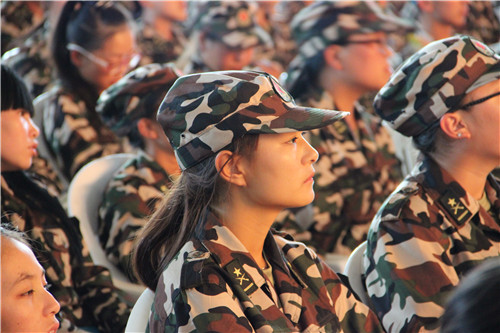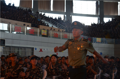 整齐的军装、挺拔的军姿,和着分列式般的掌声,昂首阔步,走向主席台,为新生呈现了一场别开生面的优秀大学生士兵的精神风貌。从普通的大学生到大家心中崇拜的英雄,他激动地讲述着自己的人生历程:当初义无反顾的选择当兵,在喀什暴乱中维护当地群众生命安全,并帮助居民种棉花、盖房,后成为一个幸运儿被选拔到阅兵式的队伍中参加阅兵训练,从新疆到北京,近乎一年的艰辛历程,喊口号嗓子沙哑、站军姿六小时双腿麻木、齐步走每天至少20公里、抗疲劳训练24小时不眠不休······阅兵当日,他所在的部队为履带自行火炮方队,欣喜之情难以言说。他的语言质朴而真诚,一言一行都激励着每一位2015级军训新生,“人生的选择有很多,贵在把握,成在坚持”,经历了严苛的受阅官兵选拔程序的他由衷说道。与新生共勉,为军训加油鼓劲。