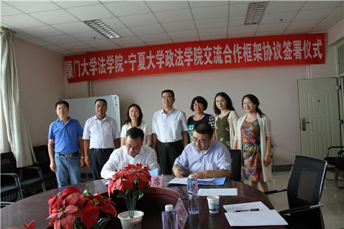 【宁夏大学新闻中心讯 金桂琴/文 虎建华/图】8月8日,厦门大学法学院与我校政法学院在文科楼8楼会议室举行交流合作框架协议签署仪式。厦门大学法学院党委书记李智勇,副院长何丽新、林秀芹,肖伟教授,我校党委书记金能明与党办、政法学院负责人、部分教师代表参加了会议。