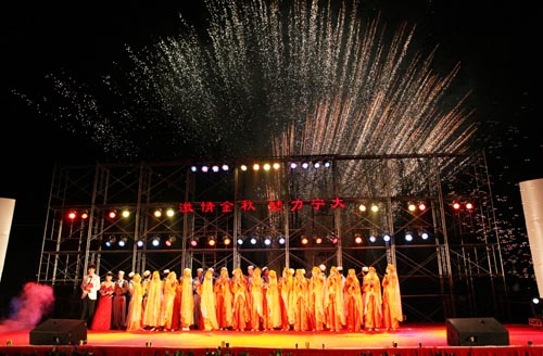 五十二华诞,情满校园;五十二华诞,桃李芬芳!在欢快的歌舞中晚会圆满落幕。嘉宾、校友和学校领导走上舞台,与演员们一一握手,共祝演出成功。刹那间,两道焰火划过天际,舞台上空呈现出灿烂夺目的焰火,全场爆发出长时间的热烈掌声,祝福宁夏大学明天更美好。