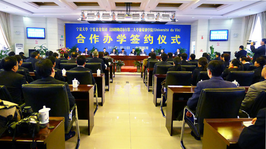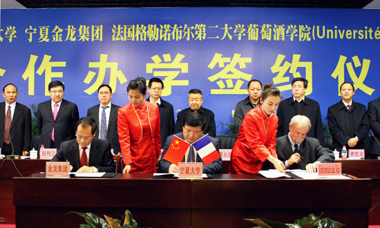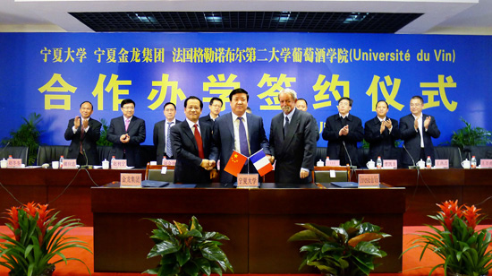 据悉,宁夏大学、宁夏金龙集团、法国格勒诺布尔第二大学葡萄酒学院将本着真诚合作、平等互利、资源共享、共同发展的原则,充分发挥三方各自的资源优势,采取国际化股份制管理方式,合作创办一所具有独立运营能力、直接服务葡萄酒产业的葡萄酒学院。采取分层次培养、动态选拔和分类指导的培养方式,培养国际型、应用型、高等职业技术人才。将开设葡萄酒酿造、品鉴、葡萄酒营销、葡萄栽培、侍酒、营销、酒店管理与酒艺等专业。部分学生可赴法学习,符合毕业及学位授予条件者,可同时获得法兰西国和中国教育部认证的本科毕业证书及学士学位证书,成绩优异者可推荐继续攻读法国相关专业的硕士、博士学位。