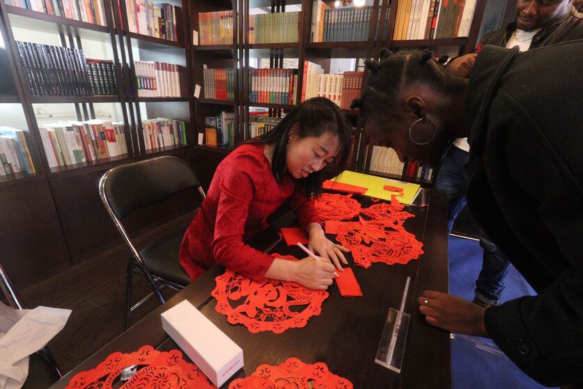 交流会现场,我校来自乌兹别克斯坦、塔吉克斯坦、土库曼斯坦、苏丹、埃及、阿富汗、印度尼西亚、叙利亚、越南、老挝、刚果(布)、喀麦隆、布隆迪、马里等国家的近30名留学生同中国青年师生共同参与剪纸、刺绣、版画、猜灯谜、书法等活动,亲身体验中国传统文化魅力,感受春节喜庆气氛,品尝浓厚的中国“年味”。