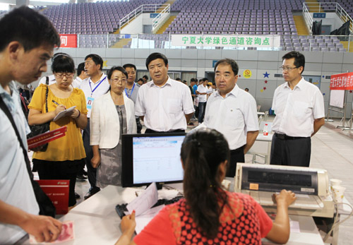 【宁夏大学新闻中心讯 黄二宁/图 胡玥/文】8月29日是2012级新生入学报到的第一天。校园里气球高悬、彩旗飘扬、笑语洋溢,一派喜庆氛围。上午,校党委书记齐岳、校长何建国、党委副书记赵利宁及各相关单位负责人到大学生活动中心和C校区视察迎新工作。
