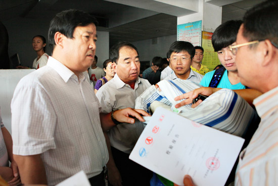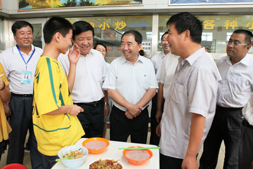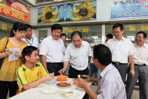 在C校区一食堂,校领导认真查看了每个窗口的饭菜品种以及供应价格,并与正在就餐的新生和新生家长进行了交流,仔细询问他们饭菜是否可口,价格能否接受。来自陕西蒲城的新生家长满意地说,价格比家里还要便宜,认为食堂的饭菜味道比较可口。在C校区5号楼,后勤集团徐竹山总经理向校领导介绍了今年新生卧具发放和宿舍入住情况。据悉,为确保新生被褥的质量,杜绝“黑心棉”现象,我校今年新生卧具产品全部经过相关部门的检验,有合格的检验报告。