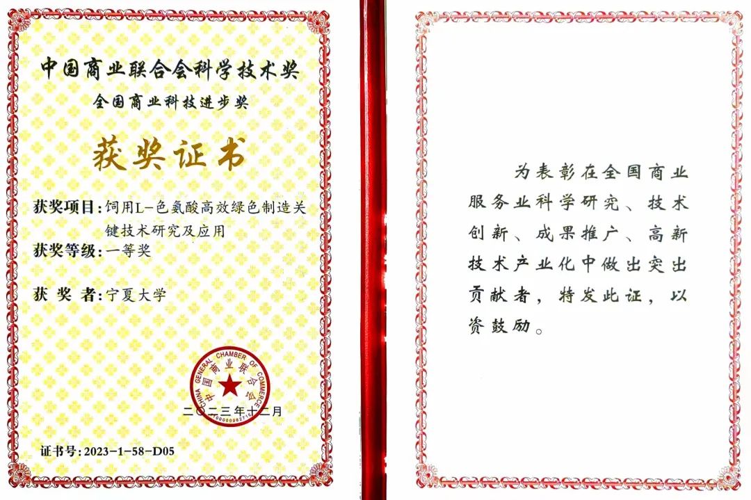 “饲用L-色氨酸高效绿色制造关键技术研究及应用”项目获奖证书。(图片由受访者提供)