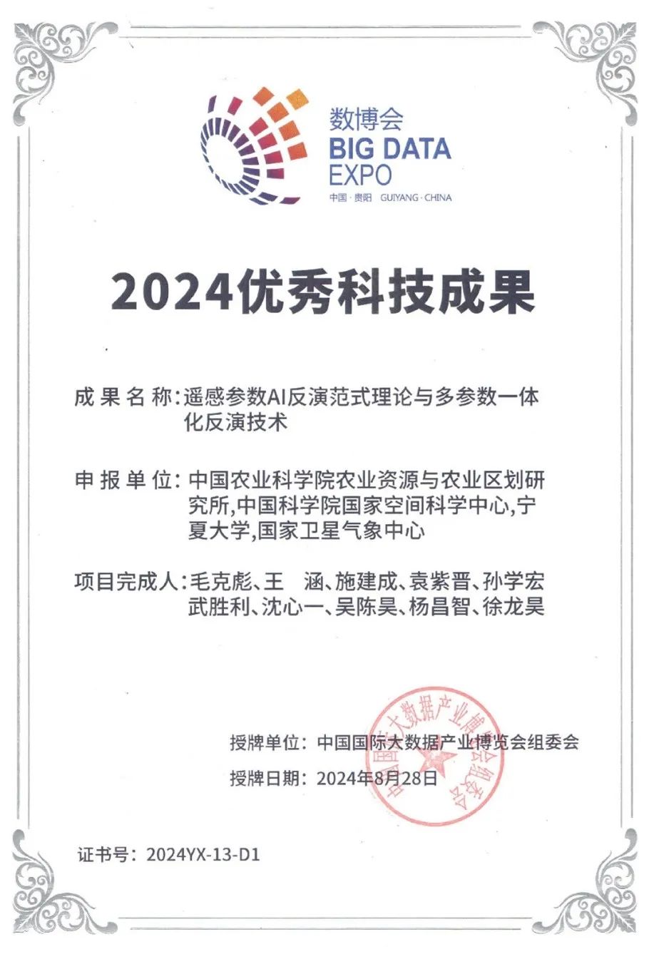 “遥感参数AI反演范式理论与多参数一体化反演技术”项目获奖证书。(图片由受访者提供)