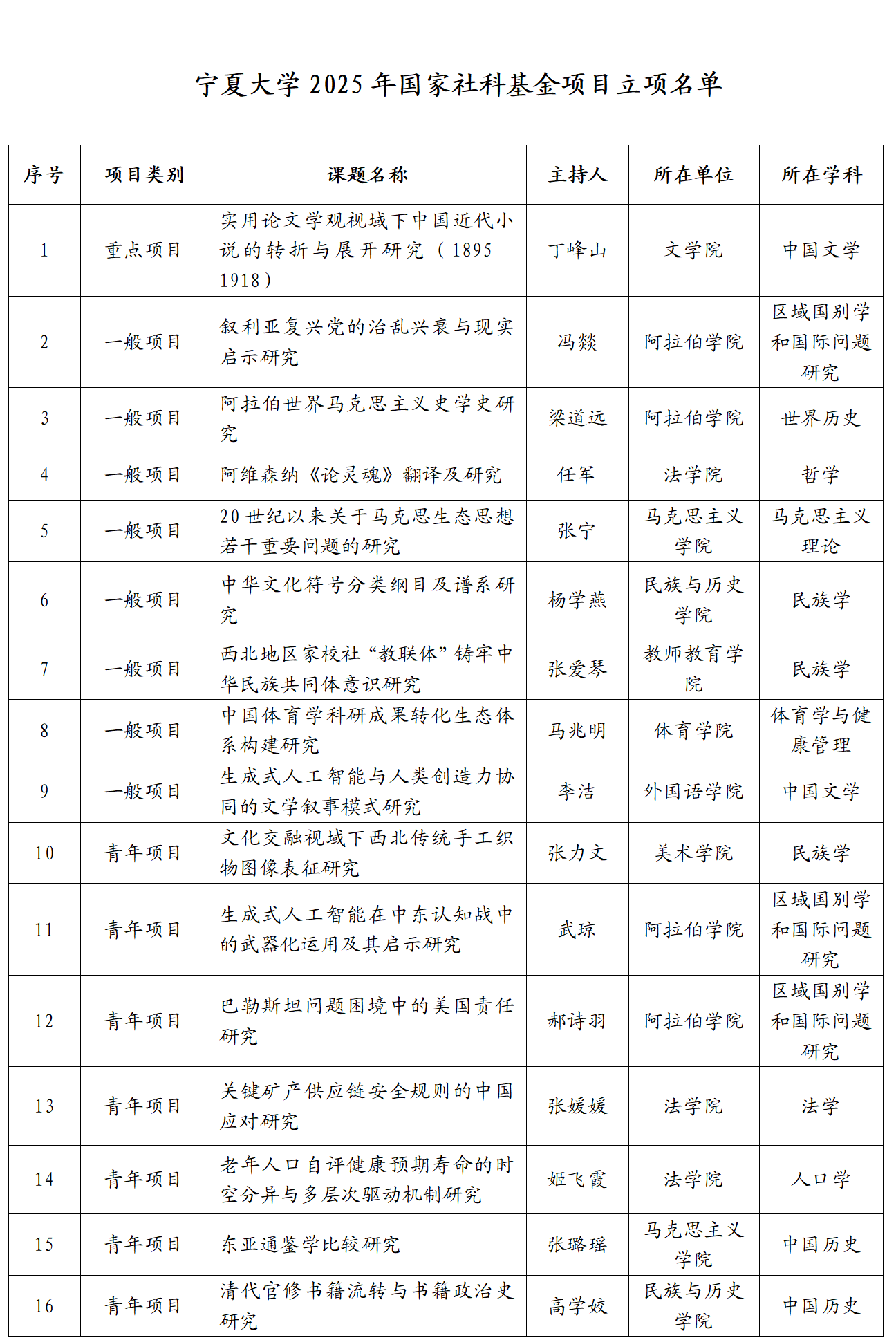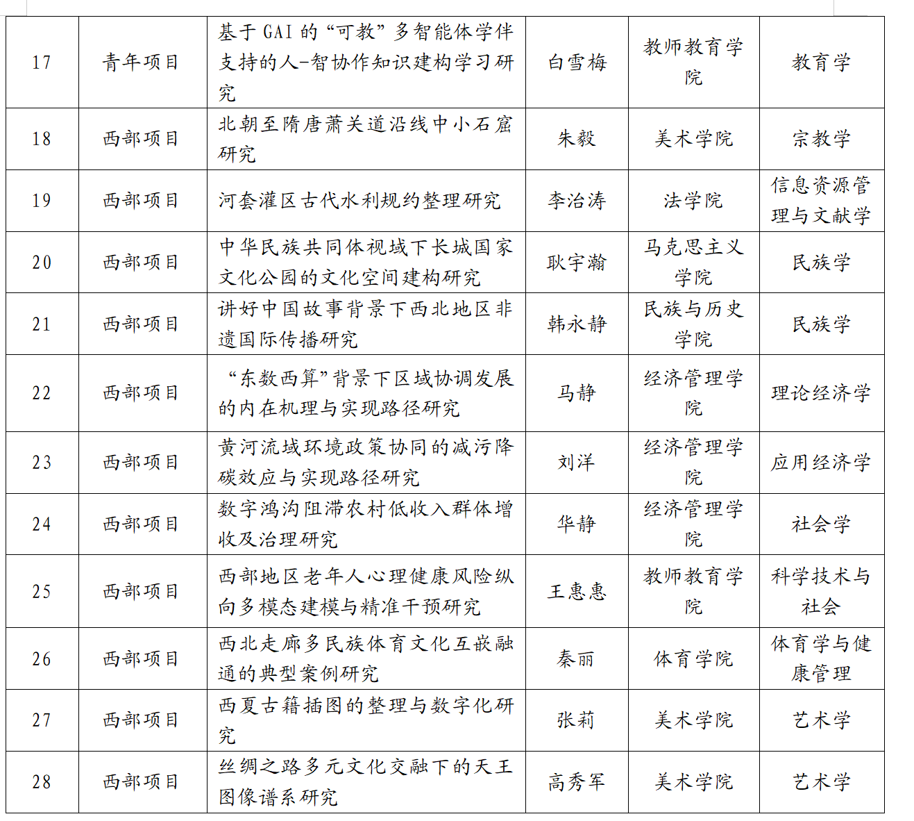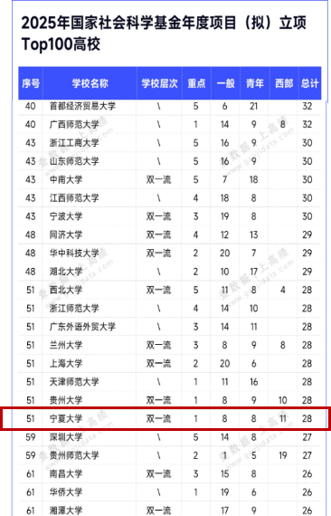【宁夏大学新闻中心讯 人文社会科学处】近日,2025年国家社科基金教育学、艺术学和年度项目立项结果先后正式公布,我校共有28个项目获得立项资助(其中重点项目1项、一般项目8项、青年项目8项、西部项目11项),立项数创“十四五”期间我校国家社科基金项目立项最好成绩。2025年度我校国家社科基金立项数在全区位居第1名(约占全区立项总数的55%),在Z14高校中位居第4名,在全国高校中位居第51名。目前,仍有部分国家社科基金项目(如冷门绝学研究专项、高校思想政治理论课研究专项、后期资助项目等)正在组织申报或评审中。