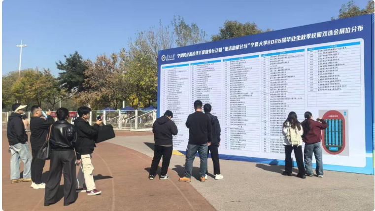 “就”在金秋,“职”达未来。10月17日下午,宁夏民企高校携手促就业行动暨“宏志助航计划”宁夏大学2026届毕业生秋季校园双选会,在宁夏大学文萃校区举行,通过搭建用人单位与毕业生双向选择平台,促进“稳就业”“保就业”。