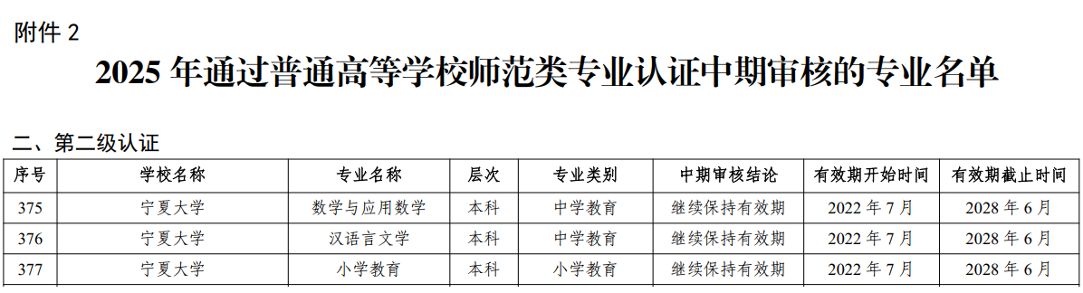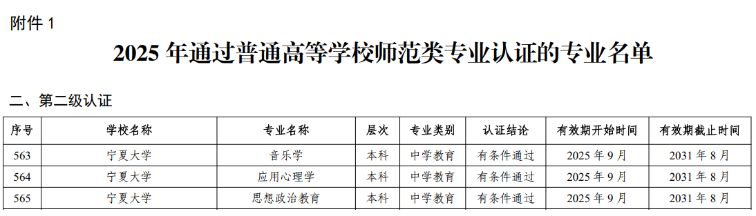 【宁夏大学新闻中心讯 本科生院】近日,教育部办公厅发布《关于公布2025年通过普通高等学校师范类专业认证专业名单及中期审核专业名单的通知》(教师厅函〔2025〕18号)。我校音乐学、应用心理学、思想政治教育等3个专业通过师范类专业第二级认证,有效期六年;数学与应用数学、汉语言文学、小学教育等3个专业通过师范类专业认证中期审核,继续保持原认证有效期。截至目前,我校14个师范专业已全部通过师范类专业第二级认证,标志着我校师范人才培养体系质量建设取得重要阶段性成果。