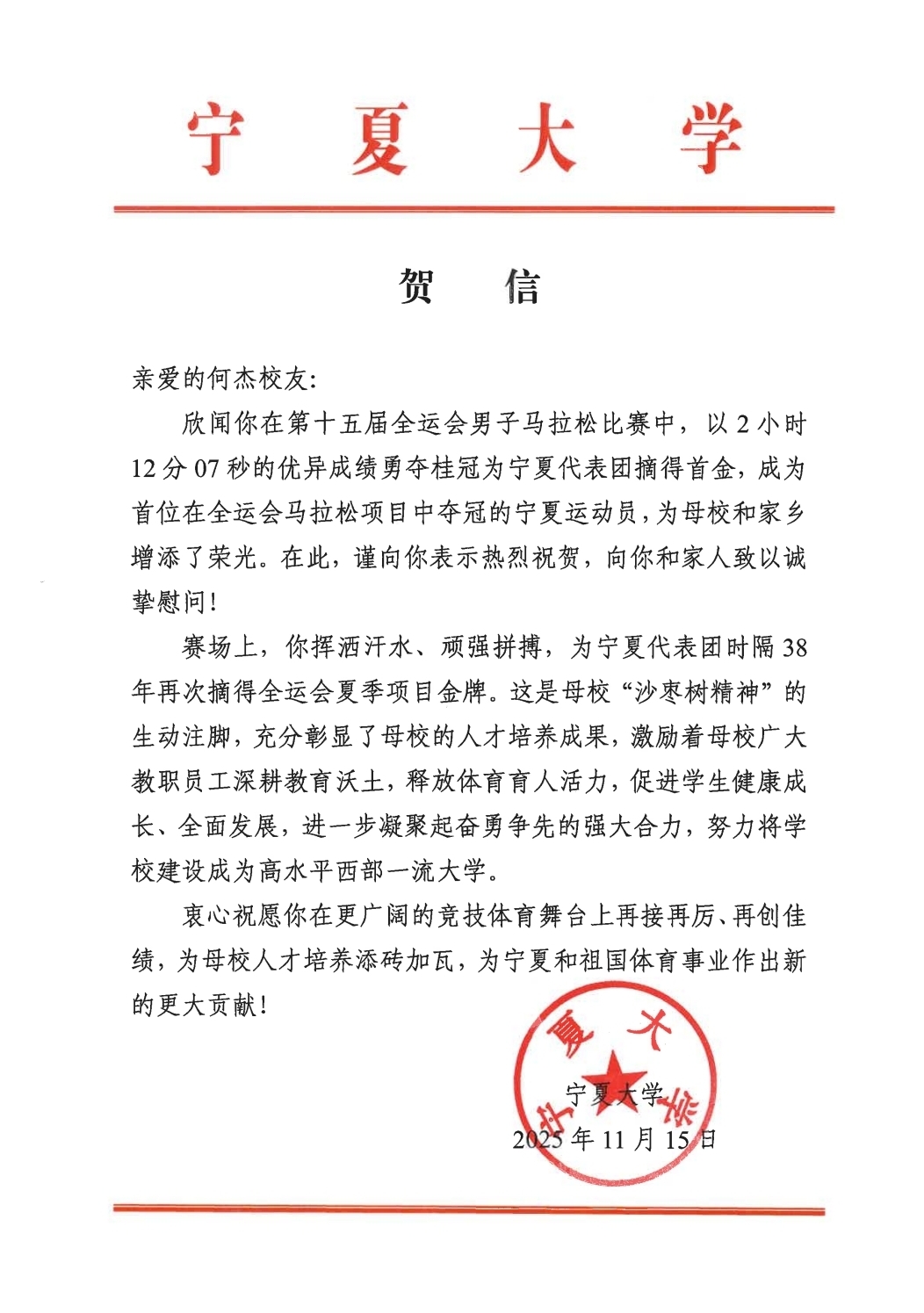 宁夏大学谨向何杰校友表示最热烈的祝贺!他的胜利激励着每一位宁大学子勇于追梦、不畏艰难。母校为他而骄傲,也将继续关注与支持他在未来国内外赛场上再创佳绩,为宁夏和祖国体育事业作出新的更大贡献!(文章部分内容来源于宁夏日报客户端,图片来源于宁夏体育运动训练管理中心公众号)