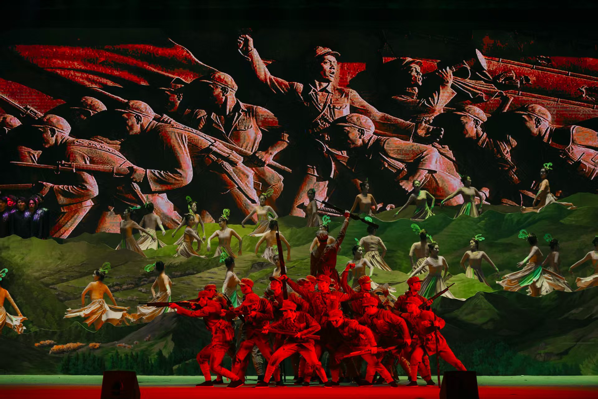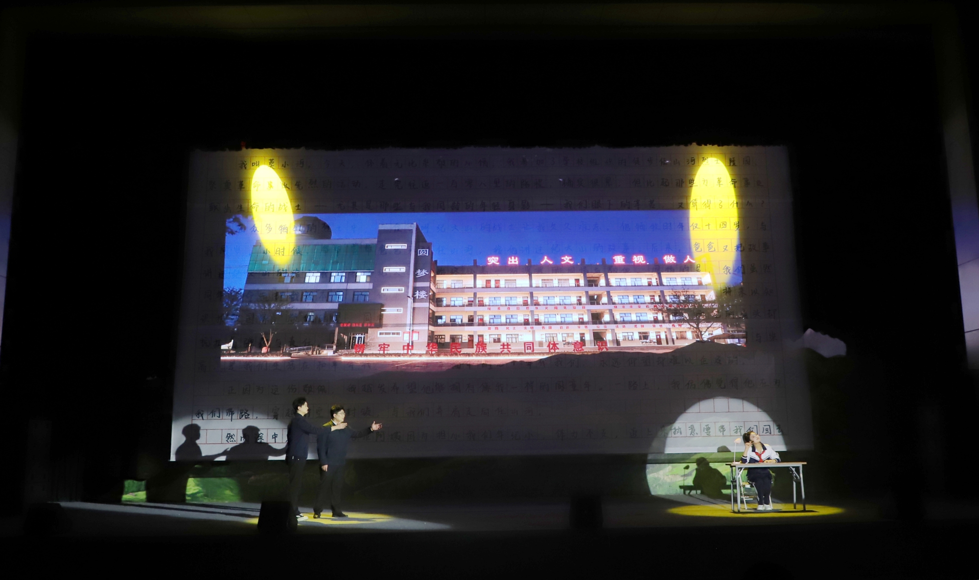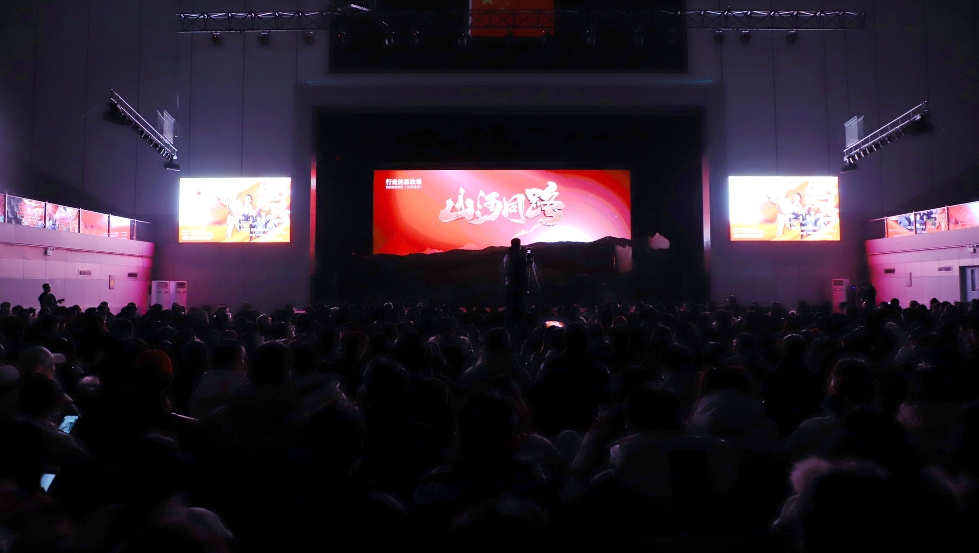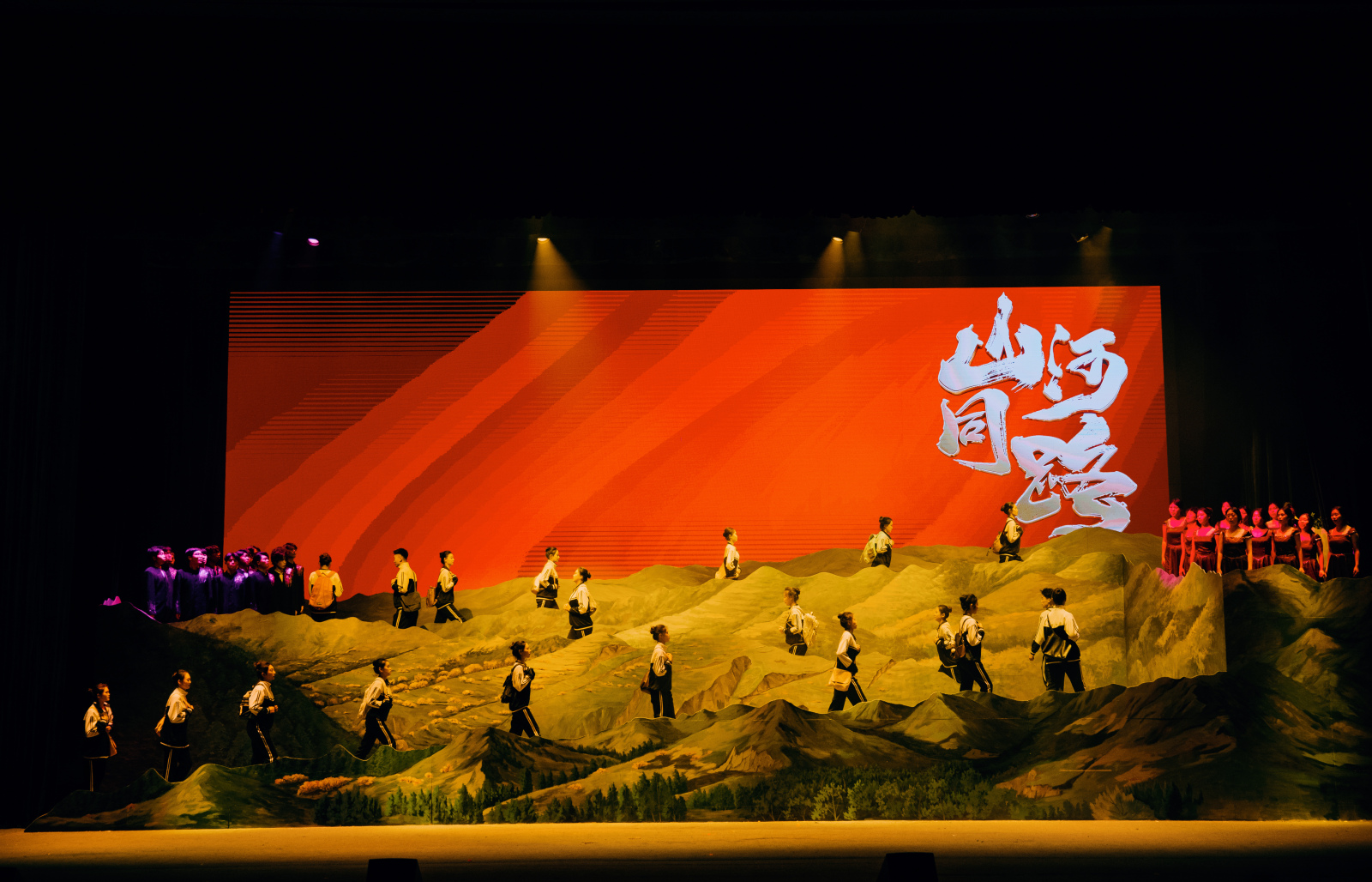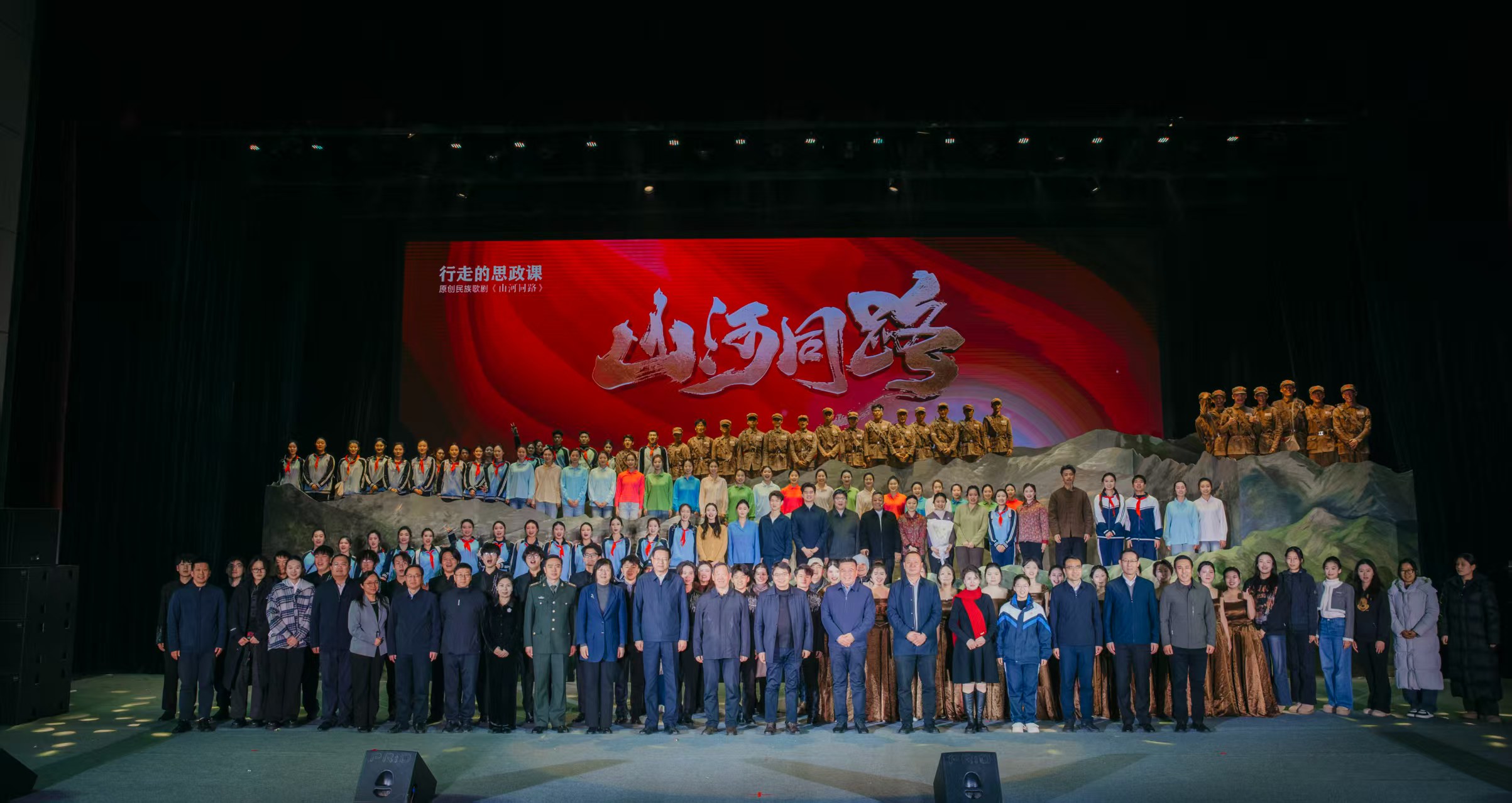 【宁夏大学新闻中心讯 冯禹君/文 王文娣、李明花、姬晓姗、张志明/图】寒冬辞旧岁,红脉启新程。12月30日晚,由宁夏大学出品的行走的思政课——原创歌剧《山河同路》在文萃校区大学生活动中心震撼上演。该剧以固原市弘文中学(原固原二中初中部)师生连续三十年徒步108里祭扫英烈的感人事迹为蓝本,将“行走的思政课”从黄茆山路搬上艺术舞台,为师生呈现了一堂跨越时空、触及灵魂的思政大课。自治区党委宣传部、教育工委、文化和旅游厅相关领导和学校中层以上干部及师生代表3000余人共同观看演出。