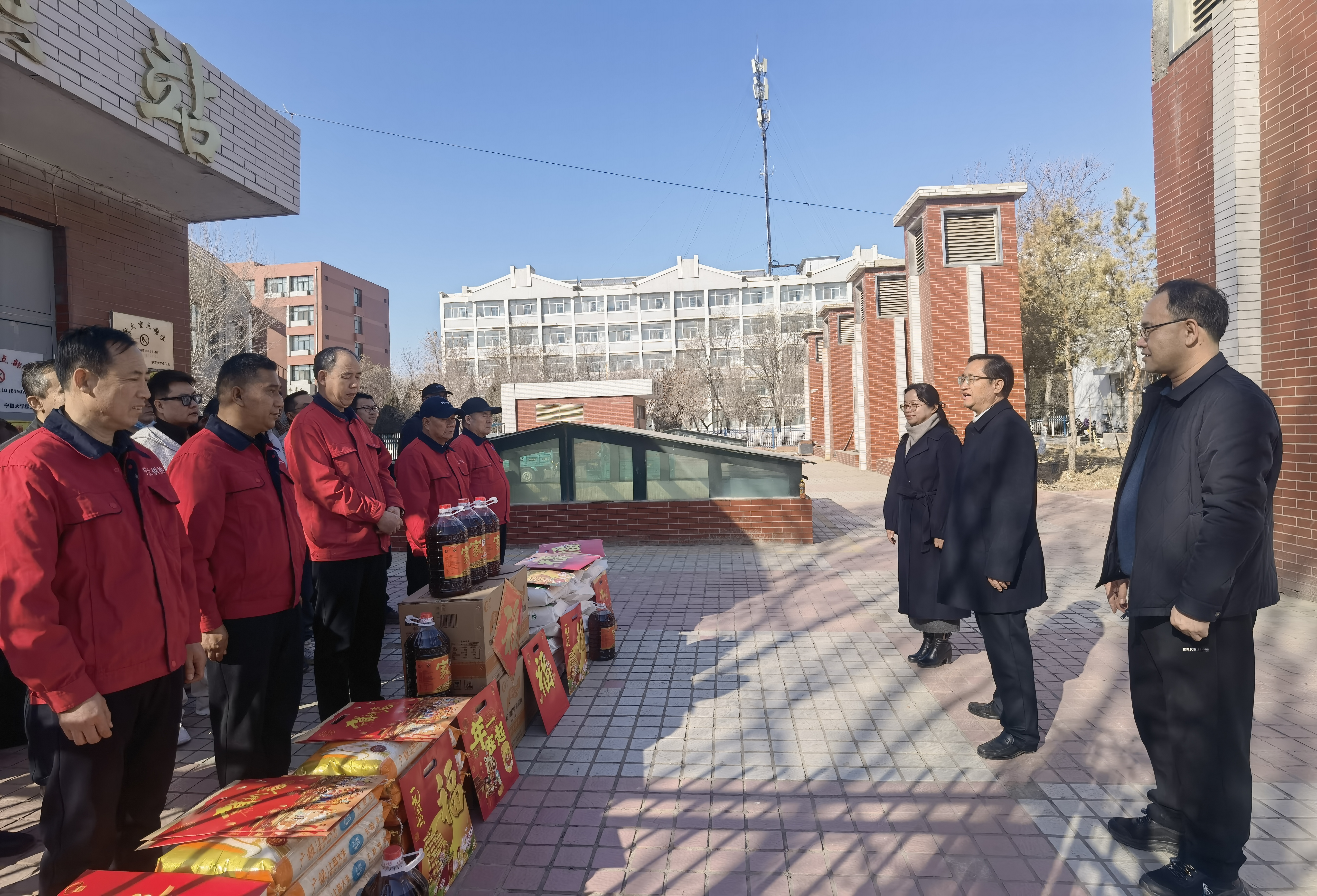 校领导一行先后前往中卫校区、怀远校区、贺兰山校区、文萃校区、朔方校区、金凤校区、新华学院和附属中学,深入校园保卫、勤务保障、水电暖运维、学生公寓管理、保洁环卫、食堂服务、物业保障等工作一线,与在岗职工亲切握手、暖心交谈,详细了解大家的工作生活、值班值守、后勤保障等情况,对大家节日期间坚守岗位、履职尽责的担当精神表示高度肯定,并为职工们送上新春祝福与学校精心准备的慰问品。