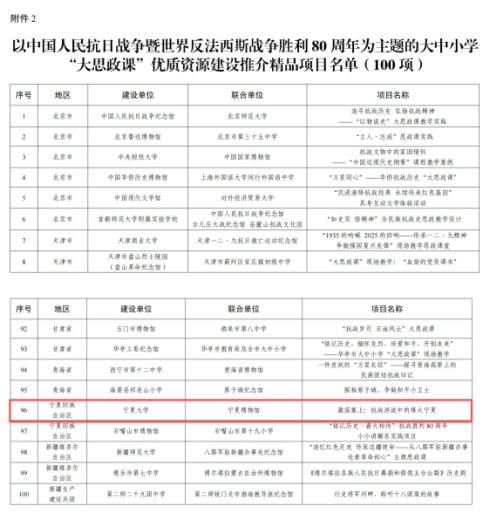 【宁夏大学新闻中心讯 马克思主义学院】近日,教育部相继公布首批新时代学校思想政治教育典型案例、以中国人民抗日战争暨世界反法西斯战争胜利80周年为主题的大中小学“大思政课”优质资源建设推介项目入选名单。我校组织申报的《建强“四个体系”构建铸牢中华民族共同体意识“大思政”育人机制》成功入选首批新时代学校思想政治教育典型案例“新时代伟大变革实践育人大课堂”部分,《激荡塞上:抗战洪流中的烽火宁夏》凭借鲜明的红色主题、独特的历史视角、丰富的资源呈现与创新的育人模式,成功入选大中小学“大思政课”优质资源建设推介精品项目。两个项目均由马克思主义学院组织申报。