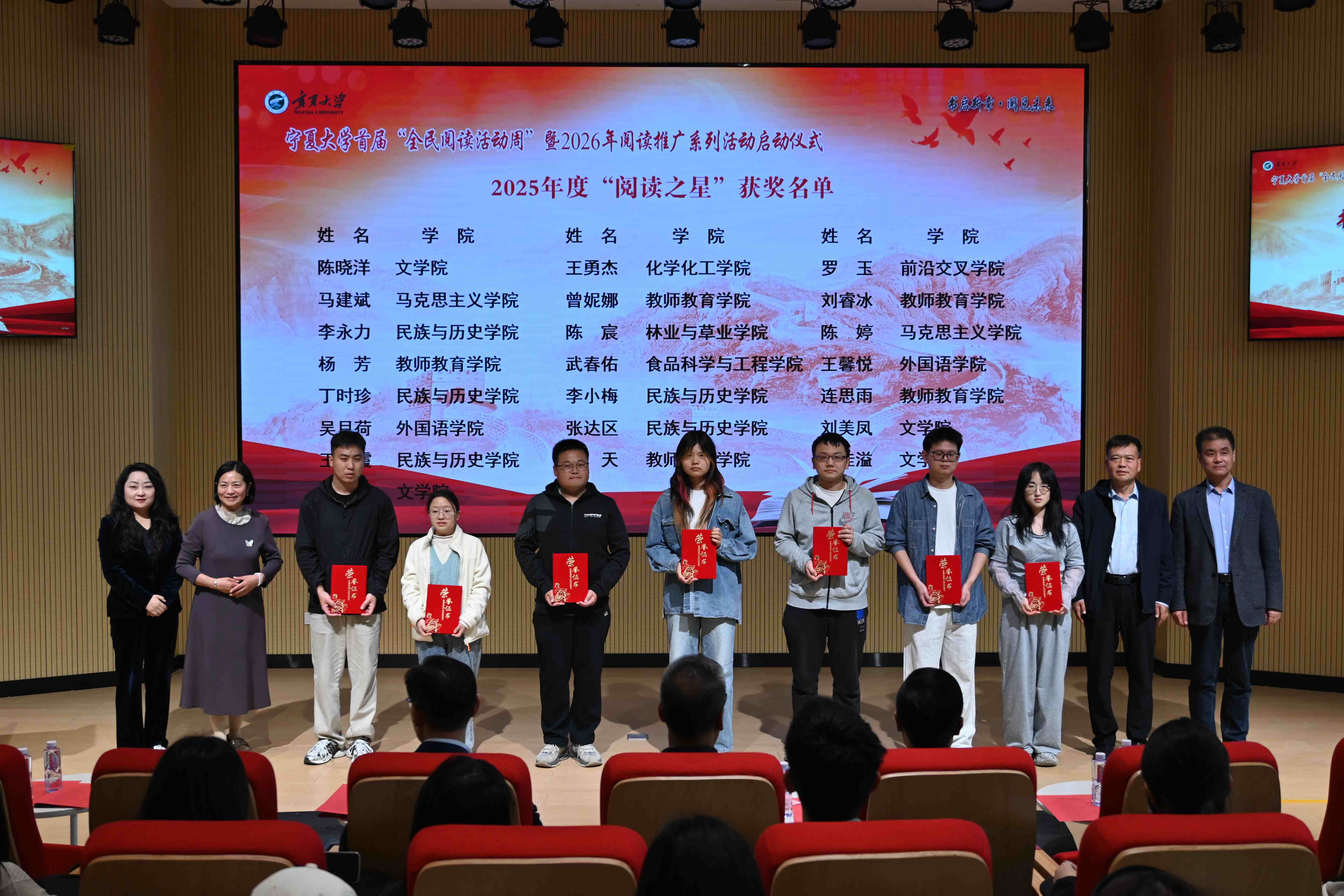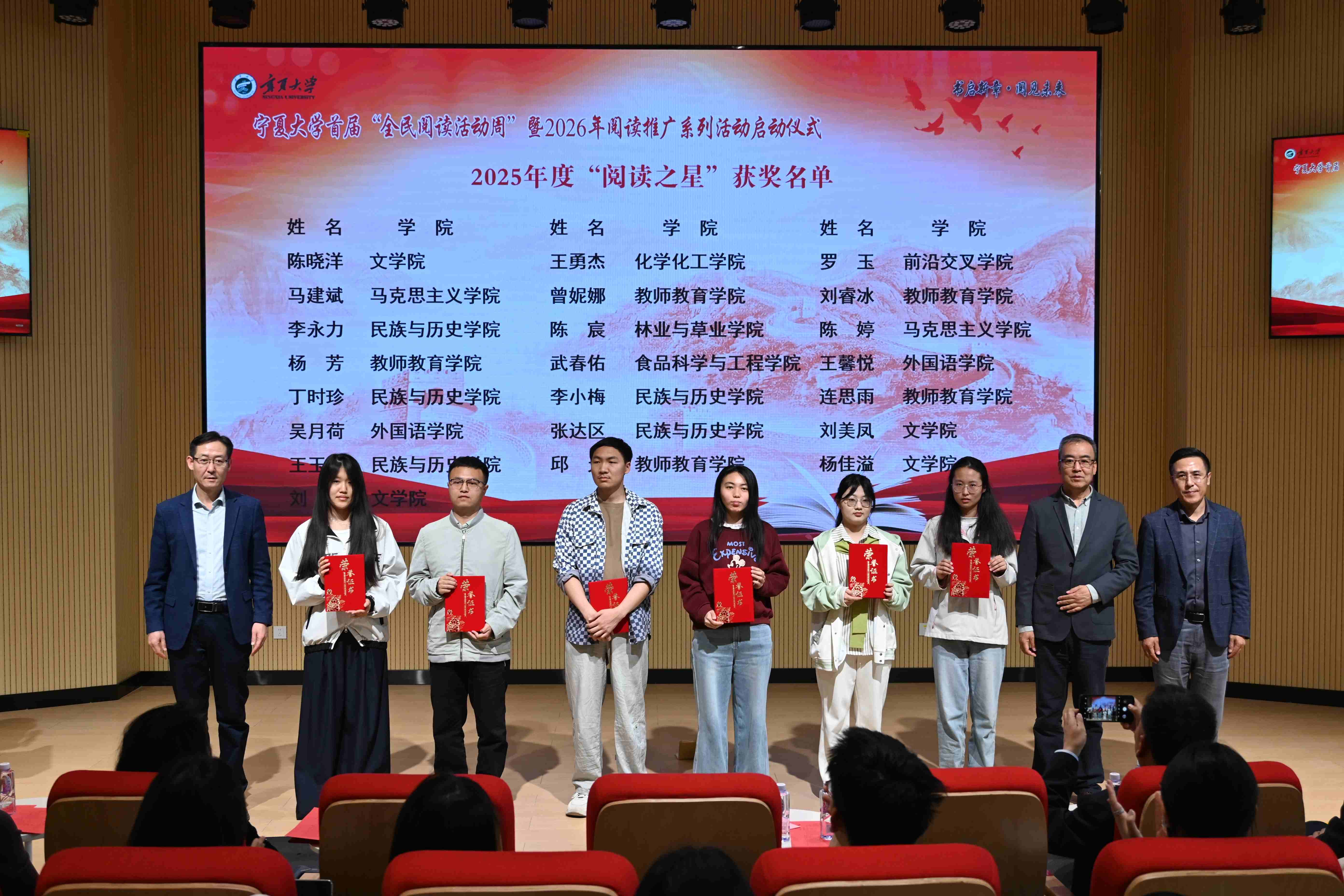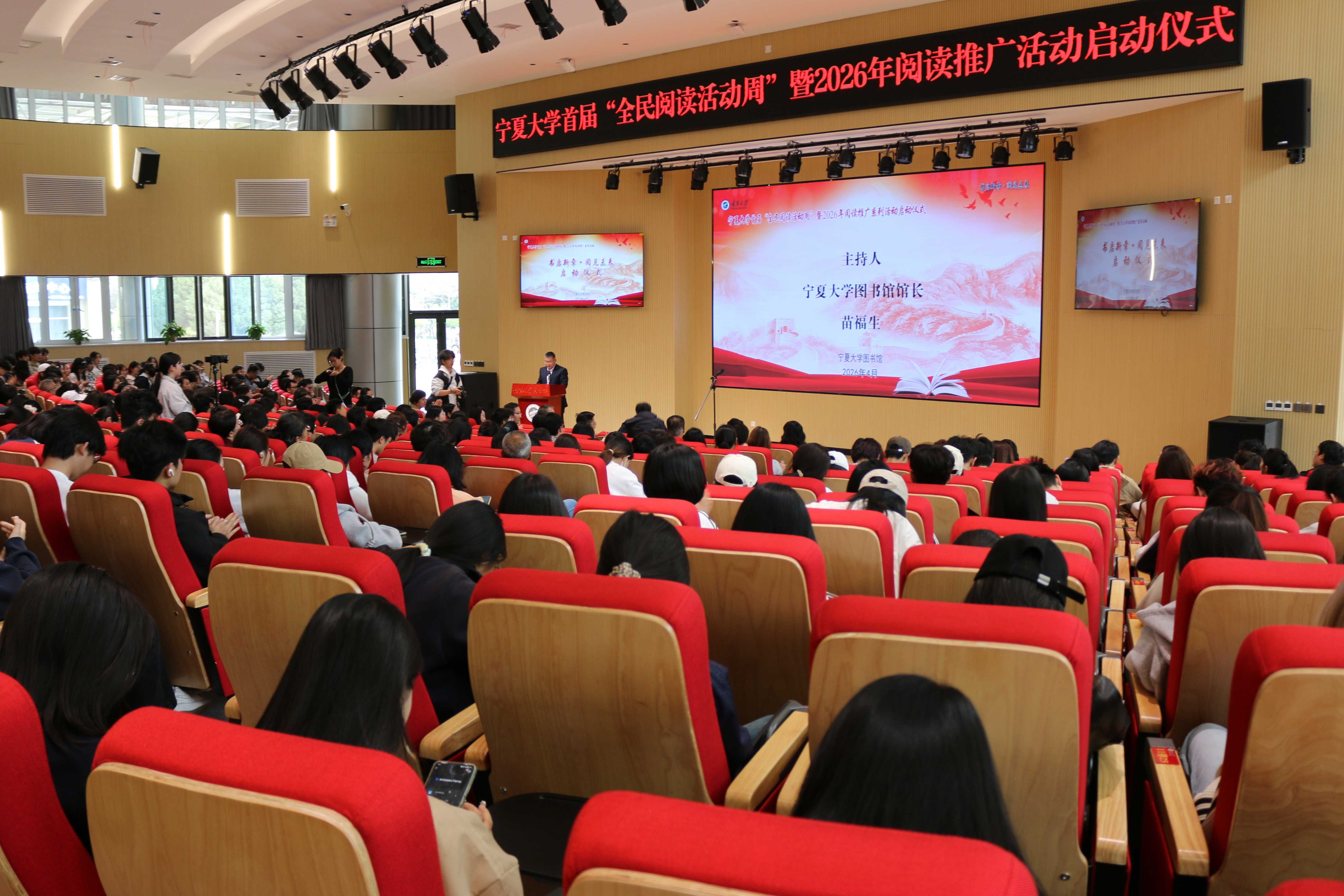 【宁夏大学新闻中心讯 图书馆/文 学生记者陈帅仰 马彩虹 图书馆/图】为深入贯彻《全民阅读促进条例》,积极响应国家全民阅读号召,持续打造书香校园文化阵地,4月22日,宁夏大学首届“全民阅读活动周”暨2026年阅读推广活动在怀远校区逸夫图书馆学术报告厅隆重启动。宁夏文联党组成员、副主席、《朔方》主编魏邦荣,宁夏大学党委常委、副校长车进,校党委常委、宣传部部长高永兴,阳光出版社负责人施娜,宁夏文联文学艺术院副院长、《朔方》副主编杨建虎,宁夏文艺评论家协会副主席、《朔方评论》执行主编王晓静,以及宁夏大学图书馆班子成员、师生代表共同参加启动仪式。图书馆馆长苗福生主持活动。