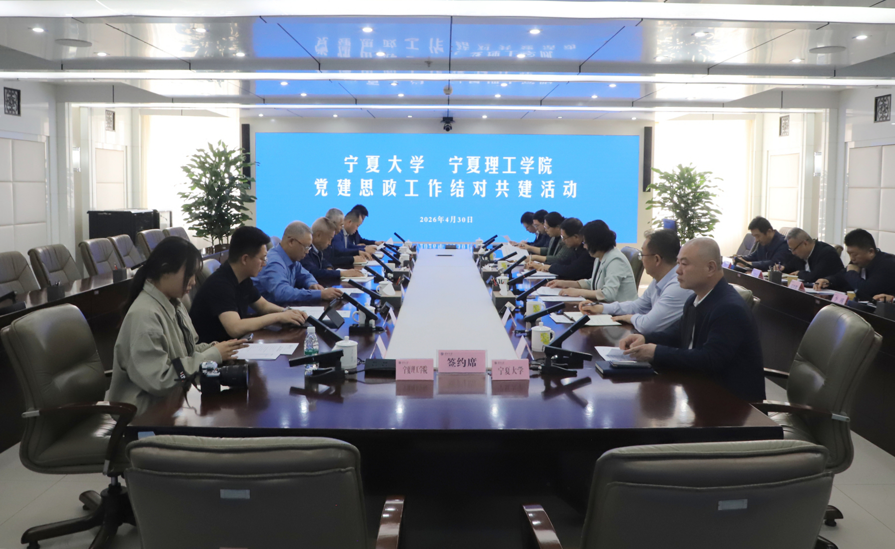 【宁夏大学新闻中心讯 杨雯/文 姬晓姗/图】为贯彻落实《中共中央办公厅关于加强民办学校党的建设工作的意见》精神,落实自治区教育工委、教育厅关于公办高校与民办高校党建思政工作结对共建有关部署要求,推动公办高校与民办高校党建思政工作共建共享、协同发展,4月30日下午,宁夏大学与宁夏理工学院党建思政工作结对共建活动在宁夏大学德勤楼11楼会议室举行,两校正式签署党建思政工作结对共建协议,标志着两校党建思政结对共建工作正式迈入规范化、常态化、制度化的新阶段。