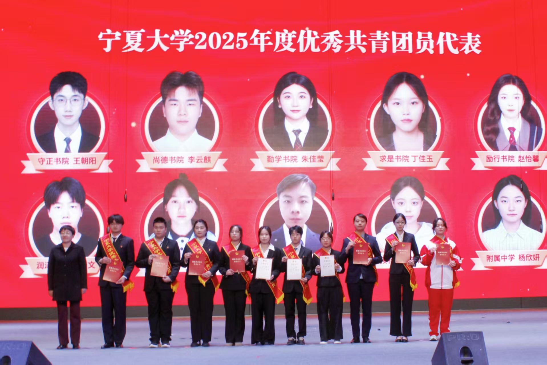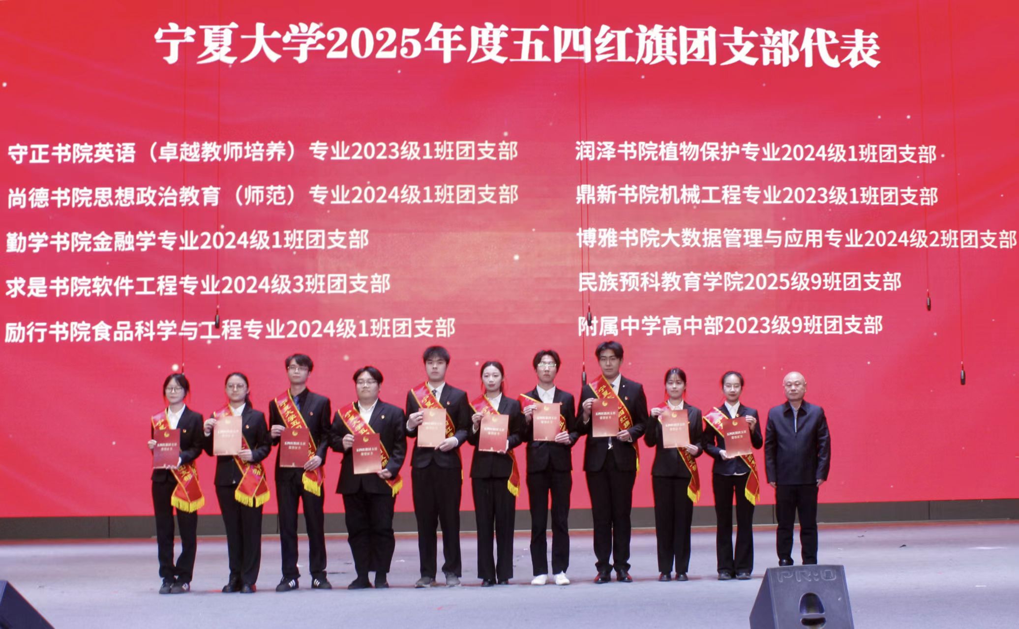 学校党委组织部、党委宣传部、党委统战部、本科生院、科学技术处、党委学生工作部(学生处)、研究生院等职能部门负责人,各书院、民族预科教育学院、附属中学分管团学工作的党委(党总支)负责人及团委书记、副书记,宁夏老年大学宁夏大学分校、附属小学、后勤保障部幼教服务中心等附属单位负责人,全体获奖师生与青年学生代表参加活动。