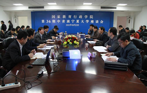 【宁夏大学新闻中心讯 黄二宁/图 翟伟/文】10月22日上午,国家行政学院第36期高校中青年干部培训班学员到我校学习考察。培训班学员与我校有关部门责任人就宁夏高等教育改革发展的基本情况和高校管理体制创新等进行了座谈交流。我校副校长谢应忠出席座谈会。