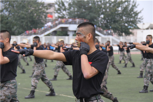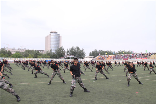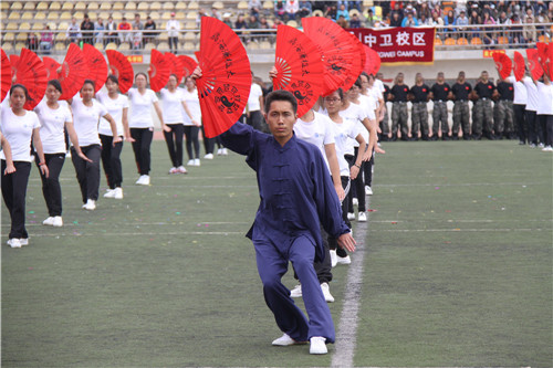 随后,精彩的团体表演开始。葡萄酒学院代表队带来了精彩的大学体育学生太极功夫扇教学展示。同学们动作舒展大方,将太极功夫扇使扇子的挥舞和太极的运动技巧灵活结合,使武术动作与中国功夫和歌曲旋律巧妙结合;国防生代表队军体拳汇报表演展示了固我国防的军人风采,脸画迷彩,一身戎装,一招一式,杀声震天;来自不同学院的1080名同学带来第九套广播体操表演,他们以富有青春活力的青春旋律、整齐有序的队列、矫健有力的动作,充分展现了当代大学生奋发向上的精神风貌。