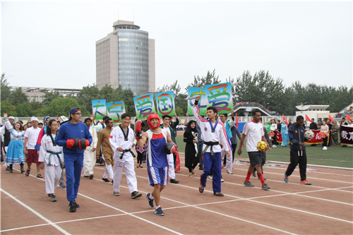 在庄严的国旗方阵和彩旗方阵的带领下,全校各学院方阵,迈着整齐的步伐,缓缓入场。各方阵各具风采,展现了各院师生独特的风格:新华学院代表队带着他们亲手制作的机器人跳起了最萌《小苹果》;国际教育学院留学生们打着“爱中国爱宁大”的标牌出场,一段精彩的体育运动表演展示了各国不同的体育文化;民族预科教育学院代表队身着民族服装,展现了民族大团结的景象;音乐学院学子具有回族风情的舞蹈展示,赢得了全场喝彩。