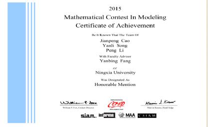 【宁夏大学新闻中心讯 数学计算机学院 李鹏/文】 近日,由数学计算机学院房彦兵副教授指导、曹健鹏、宋艳丽和李鹏三名本科生组成的参赛队,荣获2015美国大学生数学建模竞赛(MCM/ICM)Honorable Mentions奖。这是迄今为止,宁夏大学生首次获得该奖项。