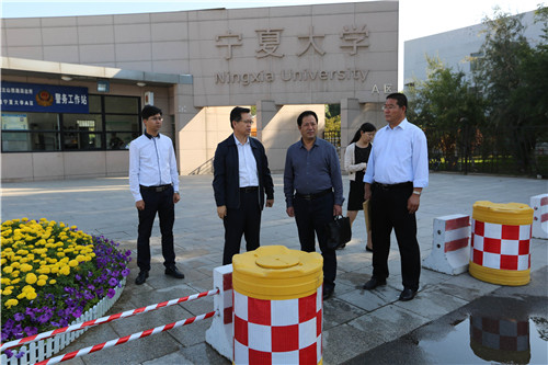 【宁夏大学新闻中心讯 张新民 张玥/文 王莹/图】为认真贯彻落实党中央、国务院关于加强安全生产工作的一系列重大决策部署,根据教育部、自治区安委办和自治区教育厅关于切实做好2015年秋季开学学校安全工作的通知,9月14日上午,自治区教育工委副书记赵建峰一行,对我校秋季开学安全工作进行了专项检查督导。校党委副书记赵利宁,党办、校办、保卫处、后勤集团等相关部门负责人,分成四个工作组陪同检查组,对学校的安全资料、消防设施、交通设施、防暴器材、重点实验室、食堂等重点单位和部位进行了全面检查。