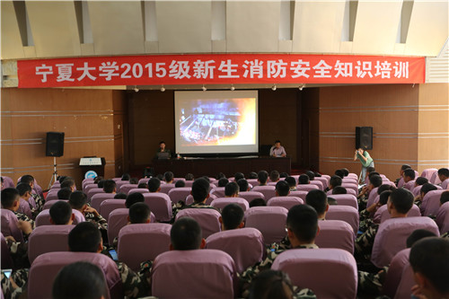 【宁夏大学新闻中心讯 张新民 李尚平/文 王莹/图】为增强新生消防安全意识,提高消防技能和应对突发事件的能力,9月14日下午,在校本部B区图书馆一楼报告厅,保卫处、综治办举行了消防安全应急知识培训。参加2015级学生军训的500余名新生参加了培训。保卫处各科室人员组织并参加了培训,保卫处副处长张启明主持培训。
