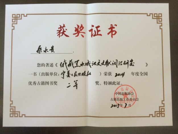 【宁夏大学新闻中心讯 图书馆】2015年7月,2014年度全国优秀古籍图书奖评奖大会在吉林长春举行。我校图书馆蔡永贵教授所著《俄藏黑水城汉文文献词汇研究》一书荣获二等奖。
