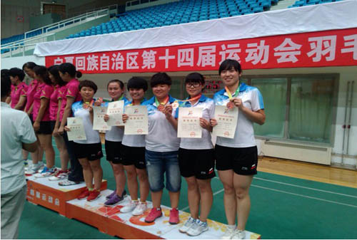 羽毛球代表队10名队员在体育学院赵奋军教练的带领下,分别取得女子团体、女子单打第三名和男子第四名的优异成绩(在全区第十三届运动会上,我校羽毛球比赛仅获男单第七名的成绩)。本届运动会羽毛球项目共有39支代表队、共计407名运动员参加此项比赛,比赛设置有男子、女子团体、单打、双打及混双7个类型的比赛。