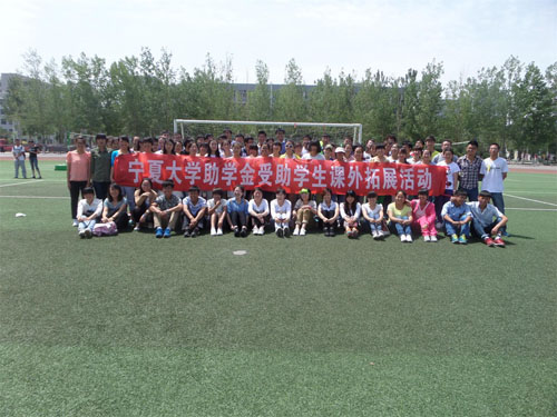 【宁夏大学新闻中心讯 学生处】6月7日,我校学生资助管理中心组织2014年度获得各类奖助学金的同学在C区田径场开展了以“健康向上,感恩回报”为主题的课外素质拓展活动。