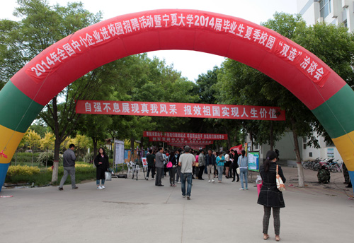 【宁夏大学新闻中心讯 大学生就业创业指导服务中心】5月14日下午,2014年全国中小企业进校园招聘活动暨宁夏大学2014届毕业生夏季校园“双选”洽谈会在我校B区金波湖畔成功举办。自治区经济和信息化委员会非公有制经济服务局、自治区教育厅学生处、宁夏大学大学生就业创业指导服务中心有关负责同志出席了洽谈会。