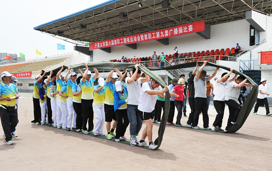 本次趣味运动会有32个单位报名参加比赛,有20个单位组队参加广播体操比赛。各代表队着装整齐、精神饱满地踏着运动员进行曲依次进入运动场,随着第九套广播体操音乐响起,20支代表队共1000名教职工广播操展示开始了,他们动作整齐,精神抖擞,英姿焕发,展现了我校教职工昂扬的精神风貌。