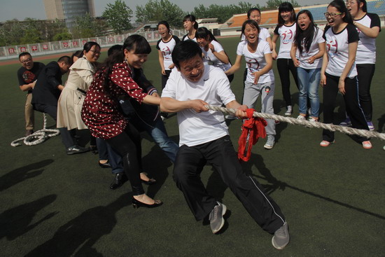 本次主题团日活动以趣味运动为主要形式,师生共同组队,其乐融融。在体育知识抢答赛中,师生踊跃抢答,让同学们从中懂得了团结合作的重要性;“你来比划我来猜”运动器材比赛中,师生通力合作,充分发挥想象力和聪明才智;体育达人竞赛中,评选出了该团支部的跳绳达人、毽球达人、俯卧撑达人等;尤其是在拔河比赛中,同学们双手紧抓绳子,使出了浑身解数,赢得冠军的王嘉琦等同学组成的小分队最后在与教师团队比拼中再次获赢。整个活动现场气氛十分愉悦,老师和同学们欢快、爽朗的笑声也吸引了周围同学们的驻足观看。