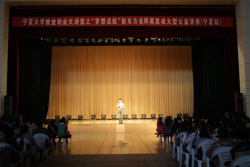 【宁夏大学新闻中心讯 学生记者 穆苗苗】面对比较严峻的就业形势,为引导我校学生在学习之余,提早关注用人单位选人用人标准,引发大学生对学习英语的再认识。3月19日下午,宁夏大学就业创业大讲堂之“梦想起航”新东方名师周思成大型公益讲座在宁夏大学C区大学生活动中心隆重举行。我校六百多名学生参加了此次活动。