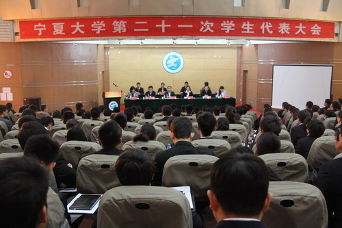 【宁夏大学新闻中心讯 团委】春光明媚,万象更新。3月22日上午,宁夏大学第二十一次学生代表大会在宁夏大学本部B区逸夫图书馆召开。宁夏大学党委书记齐岳,自治区团委副书记王伟,宁夏大学党委副书记赵利宁、副校长王春秀,自治区学联、宁夏大学党委办公室、组织部、统战部、学生党建办、学工部、保卫处、团委等相关部门负责人以及各学院党委副书记,团委书记出席大会,在全校范围内民主产生的340名学生代表参加了大会。校团委副书记、学生会秘书长马慧主持开幕仪式。全国学生联合会、自治区学生联合会及清华大学、北京大学等五十多所区内外高校学生会向大会发来贺信表示祝贺。