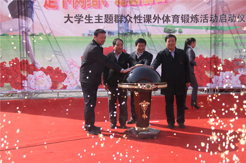 马金元、齐岳、何建国、董宏伟共同按下启动球,为“走下网络、走出宿舍、走向操场”大学生主题群众性课外体育锻炼活动启幕。