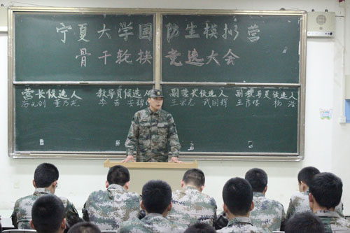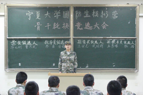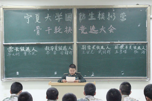 【宁夏大学新闻中心讯 选培办 李苗】为全面提升国防生综合素质,大力培养第一任职能力,锻炼提高国防生组织指挥、沟通协调等综合素质,营造紧张有序的“准军事化”氛围,3月10日,驻校选培办组织召开“宁夏大学国防生骨干轮换竞选大会”。