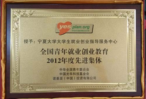 【宁夏大学新闻中心讯 就业创业指导服务中心 姬广报道】日前,由全国青年联合会、中国光华科技基金会和诺基亚(中国)投资有限公司联合主办的“诺基亚青年就业创业教育计划2012年度颁奖典礼”在北京举行。我校大学生就业创业指导服务中心荣获“全国青年就业创业教育2012年度先进集体”荣誉称号。同时,我校在第六届诺基亚青年创意·创业计划大赛暨第五届“我的新创业时代”创业故事征文大赛中荣获优秀组织奖。