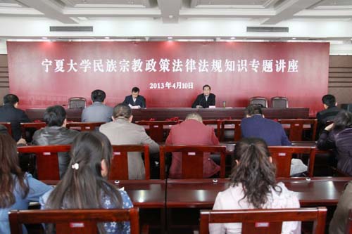 【宁夏大学新闻中心讯曾华/图 周佩/文】为全面深入宣传贯彻党的民族宗教政策,提高广大师生民族宗教政策法律法规水平,增强正确处理民族宗教问题的能力,做好抵御境外利用宗教对高校进行渗透和防范校园传教工作。4月10日下午,校党委统战部邀请自治区党委统战部副巡视员兰德明为我校各学院负责学生工作的党总支副书记、辅导员,相关部门领导干部及校学生会干部做了民族宗教政策法律法规知识专题讲座。校党委副书记赵利宁主持讲座。