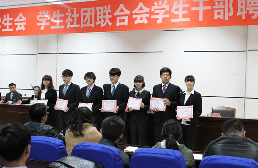 会上,马慧宣读新聘任学生干部名单。卸任校学生会主席周鹏飞、学生社团联合会主席马晨辰,新任学生主席物理电气信息学院2010级学生王曼、学生社团联合会主席政法学院2010级秦强分别发言。参会领导为新任校学生会、学生社团联合会干部颁发聘书,并为卸任学生干部赠送纪念品。