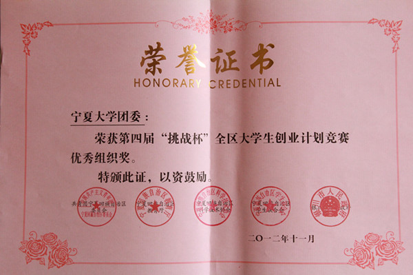 【宁夏大学新闻中心讯 校团】近期,从第四届“挑战杯”全区大学生创业计划竞赛组委会传来喜讯:我校团委以良好的组织能力和优秀的竞赛成绩荣获第四届“挑战杯”全区大学生创业计划竞赛“优秀组织奖”荣誉称号。在本次大赛中,我校学子共获一等奖3项、二等奖7项、优秀奖5项,获奖数量居全区高校之首。