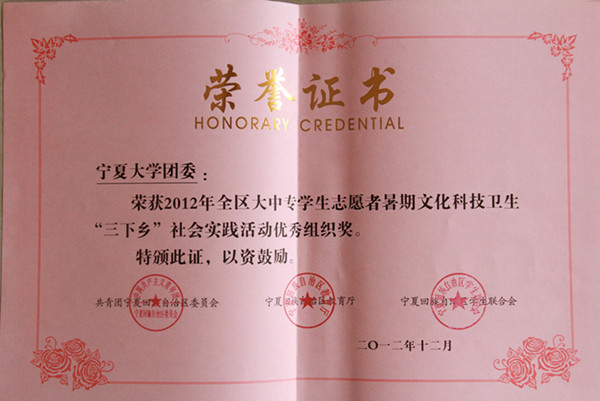 我校团委荣获2012年全区大中专学生志愿者暑期文化科技卫生“三下乡”社会实践活动“优秀组织奖”;我校志愿者协会服务生态移民团队及“晨曦”暑期社会实践团队荣获“优秀团队”荣誉称号;物理电气信息学院团委书记郑睿荣获“先进个人”荣誉称号;人文学院2010级学生宋婷婷、政法学院2010级学生王昕煜、外国语学院2010级学生马楠、体育学院2010级学生胡波等四名同学荣获“优秀队员”荣誉称号。