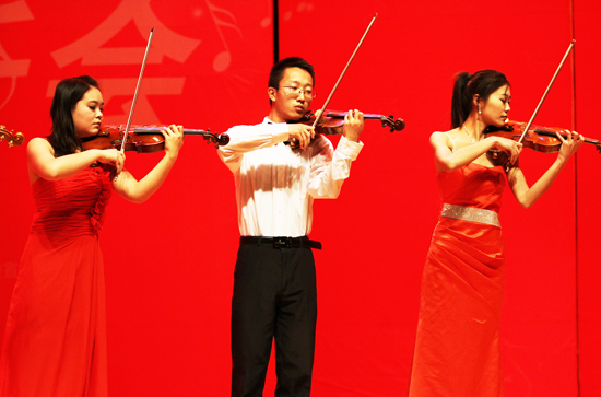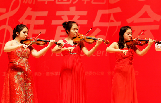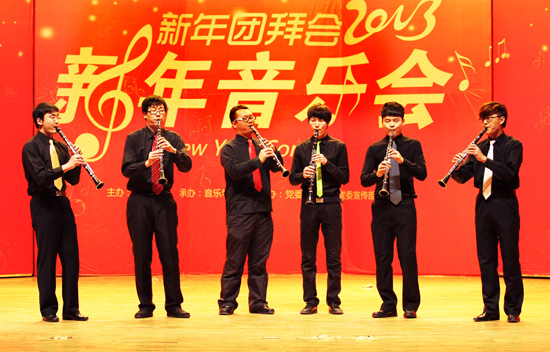由音乐学院承办,党委办公室、党委宣传部、校长办公室协办的新年音乐会,以华美的曲目和动人的演奏为广大观众呈现了一场具有强烈艺术感染力的听觉和视觉盛宴。演出在音乐学院合唱团的混声合唱《青藏高原》《神话》中拉开序幕。随后,单簧管五重奏《节日的鄂温克人》、铜管五重奏《号手的节日》,欢乐的节奏让大家的心情跟着音符起舞;女声二重唱唱《为祖国干杯》真挚动人,令观众心潮起伏;小提琴合奏《山丹丹花开红艳艳》为听众带来了饕餮盛宴。女高音独唱京剧《咏梅》,男中音独唱《延安颂》,扬琴独奏《吉普赛之歌》,原生态花儿演唱《妈妈的盖碗茶》等优秀曲目,令人激动,回味无穷。一曲民乐合奏《春节序曲》以娴熟的演奏和绝佳的配合征服了所有观众,将音乐会推向了高潮。音乐会在欢腾的乐声和全场师生热烈的掌声中落下帷幕。